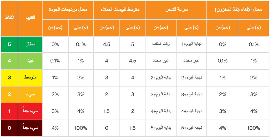 يناءً على اداء متجرك بيتم تقييم كل مؤشر من 0 إلى 5 بناءً على الحدود أدناه.